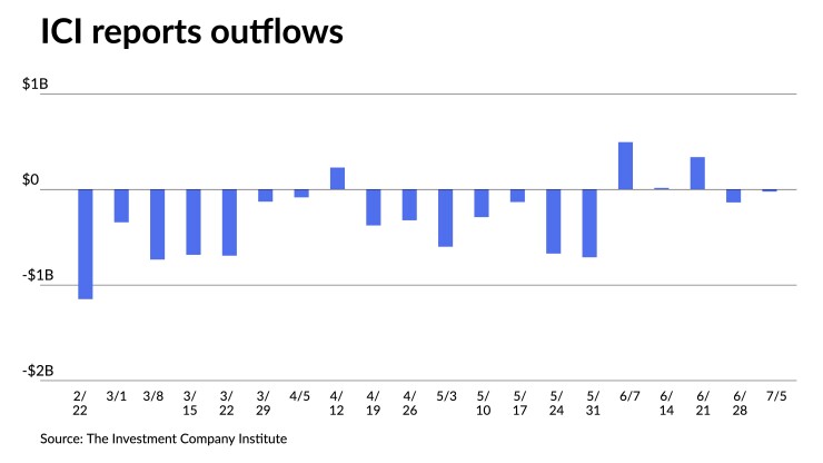 The Investment Company Institute reported investors pulled $23 million from municipal bond mutual funds in the week ending July 5, after $136 million of outflows the previous week.