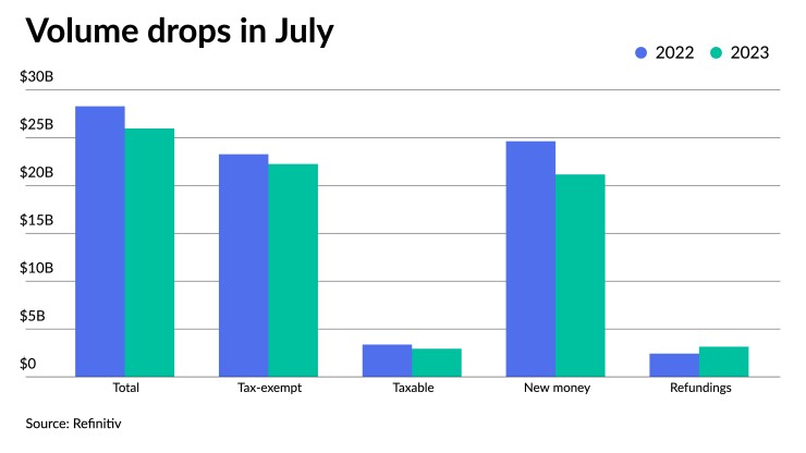 July municipal bond issuance fell 8% from 2022 as issuers dealt with another month of mixed macroeconomic concerns and rising interest rates, but the month saw the smallest drop in issuance year-over-year in 2023.