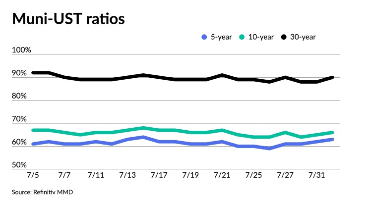 The two-year muni-to-Treasury ratio Tuesday was at 62%, the three-year at 63%, the five-year at 64%, the 10-year at 64% and the 30-year at 86%, according to Refinitiv MMD’s 3 p.m. read. ICE Data Services had the two-year at 62%, the three-year at 64%, the five-year at 63%, the 10-year at 66% and the 30-year at 90% at 4 p.m.