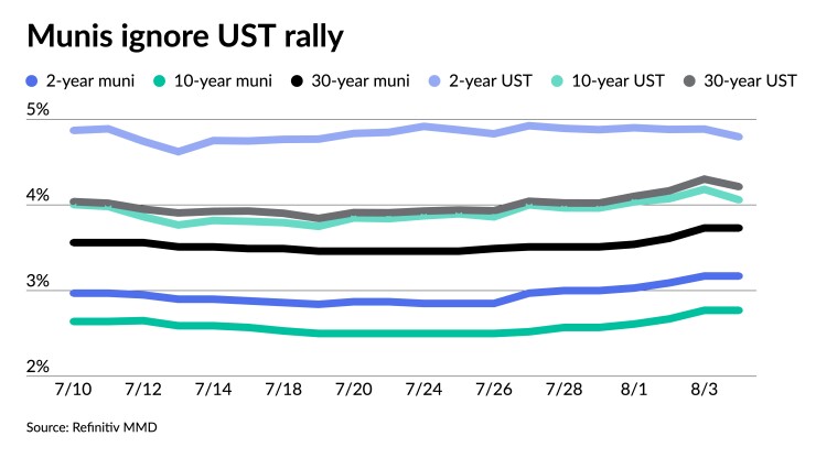 “While the current selloff may put our August issuance forecast at risk, the imbalance should keep muni-Treasury ratios low, easing some pressure on munis amid the current Treasury market selloff,” they said. “Overall, we would view the current selloff as an opportunity.”