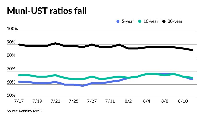 Muni to UST ratios richened again as a result. The two-year muni-to-Treasury ratio Friday was at 63%, the three-year at 64%, the five-year at 64%, the 10-year at 65% and the 30-year at 86%, according to Refinitiv MMD’s 3 p.m. read. ICE Data Services had the two-year at 64%, the three-year at 65%, the five-year at 64%, the 10-year at 66% and the 30-year at 87% at 4 p.m.