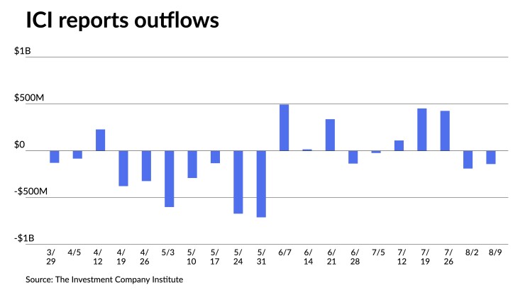 The Investment Company Institute reported investors pulled $141 million from municipal bond mutual funds in the week ending Aug. 9, after $187 million of outflows the previous week. ETFs saw inflows of $550 million after $533 billion of outflows the week prior.