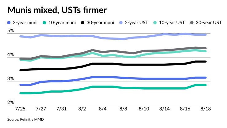“For those hoping things will be quiet on the [Federal Open Market Committee], or Fed front they can think again,” said Tom Kozlik, head of public policy and municipal strategy at Hilltop Securities Inc., adding that the Jackson Hole Symposium kicks off on Thursday and the market will be “reading the tea leaves and interested in anything said or even implied there.”