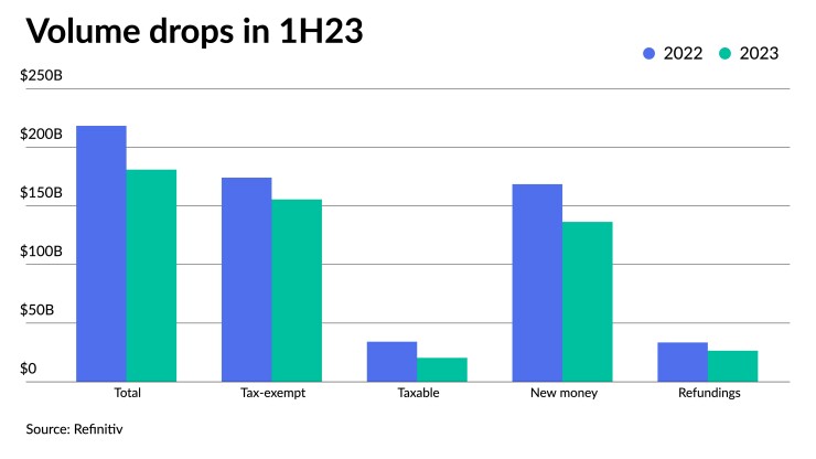 Tax-exempt issuance fell 10.7% in the first six months to $155.503 billion from $174.086 billion in 2022. Taxable issuance dropped 40.3% in the first half of 2023 to $20.424 billion from $34.209 billion in 2022 over the same period, per Refinitiv data.