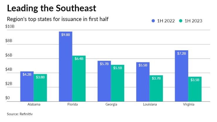 Issuers in Florida sold more bonds than those in any other Southeast state, issuing $6.4 billion of municipal debt, 34.4% less than in the first half of 2022.