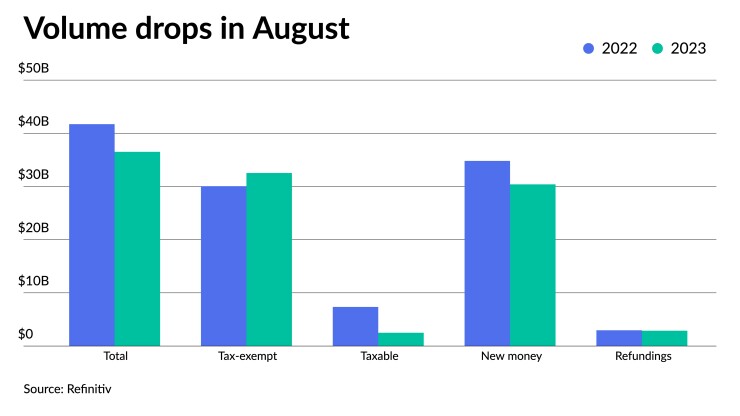 At that time, refunding opportunities were “losing economic viability, and with rates higher today, the universe of refunding candidates has dried up considerably,” Lipton said. Refundings only dropped slightly year-over-year in August but more significant decreases can be seen in previous months.
