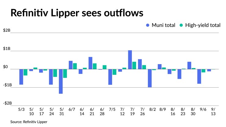 Refinitiv Lipper reported $116.737 million of outflows from municipal bond mutual funds in the week ending Wednesday following $798.474 million of outflows the week prior.