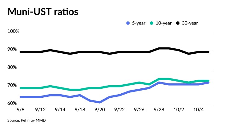 The two-year muni-to-Treasury ratio Thursday was at 73%, the three-year was at 73%, the five-year at 73%, the 10-year at 74% and the 30-year at 90%, according to Refinitiv Municipal Market Data’s 3 p.m., ET, read. ICE Data Services had the two-year at 73%, the three-year at 74%, the five-year at 72%, the 10-year at 74% and the 30-year at 90% at 4 p.m.