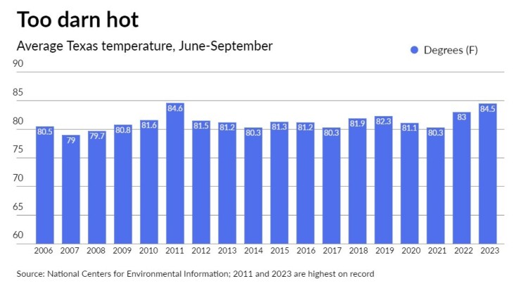 The average temperature in Texas this June through September was the second highest on record at 84.5 degrees, according to National Centers for Environmental Information data going back to 1895. The record of 84.6 degrees was set in 2011.