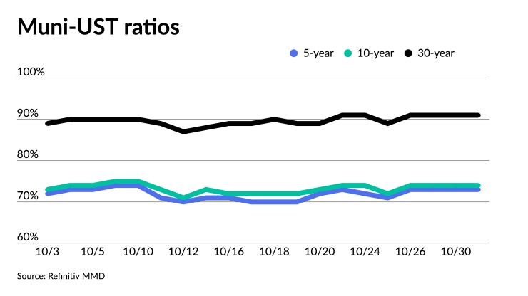 The two-year muni-to-Treasury ratio Tuesday was at 72%, the three-year was at 73%, the five-year at 73%, the 10-year at 74% and the 30-year at 91%, according to Refinitiv Municipal Market Data’s 3 p.m., ET, read. ICE Data Services had the two-year at 73%, the three-year at 74%, the five-year at 73%, the 10-year at 73% and the 30-year at 90% at 3:30 p.m.