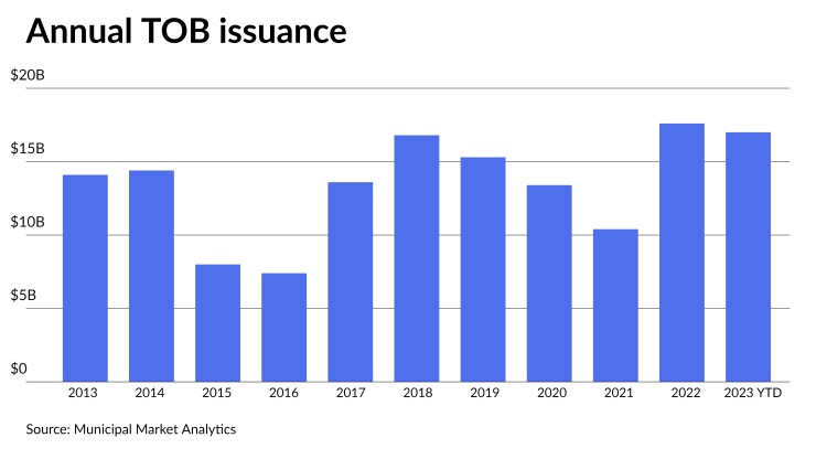 About $17 billion of TOBs have been issued so far in 2023, which is on pace to eclipse last year’s $17.6 billion, MMA said. The outstanding TOB market is at about $50 billion from highs of nearly $500 billion prior to the Financial Crisis of 2008.