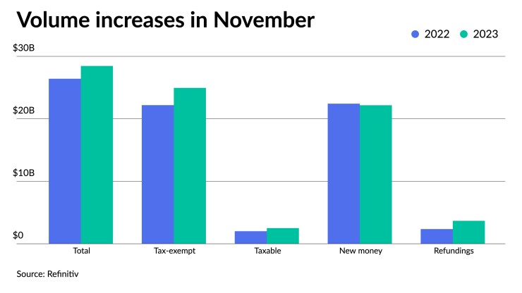 Revenue bond issuance increased 13.3% to $19.339 billion from $17.062 billion in November 2022, and general obligation bond sales fell 2.4% to $9.126 billion from $9.353 billion in 2022.
