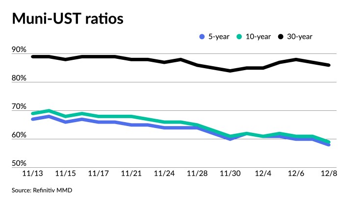 The two-year muni-to-Treasury ratio Friday was at 58%, the three-year at 58%, the five-year at 58%, the 10-year at 59% and the 30-year at 86%, according to Refinitiv Municipal Market Data’s 3 p.m., ET, read. ICE Data Services had the two-year at 60%, the three-year at 59%, the five-year at 59%, the 10-year at 62% and the 30-year at 86% at 4 p.m.
