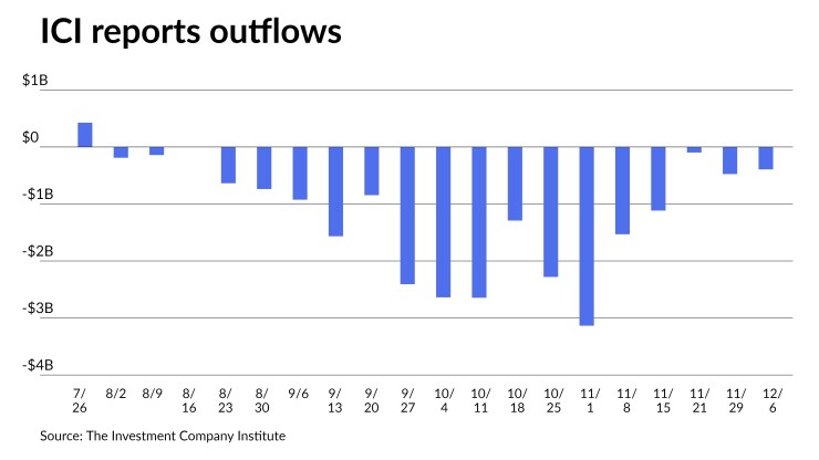 The Investment Company Institute reported more outflows from municipal bond mutual funds for the week ending Dec. 6, with investors pulling $393 million from the funds following $475 million of outflows the week prior. Exchange-traded funds also saw outflows of $40 million following $796 million of inflows the week prior.