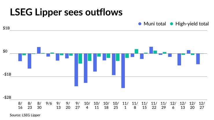 LSEG Lipper reported Thursday that investors pulled $463.7 million from muni mutual funds for the week ending Wednesday after inflows of $147 million the week prior.