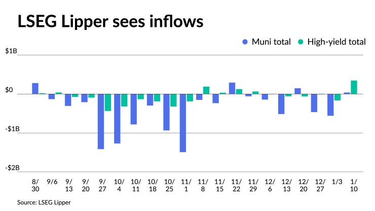 LSEG Lipper reported Thursday that investors added $38.7 million to muni mutual funds for the week ending Wednesday after outflows of $558 million the week prior.