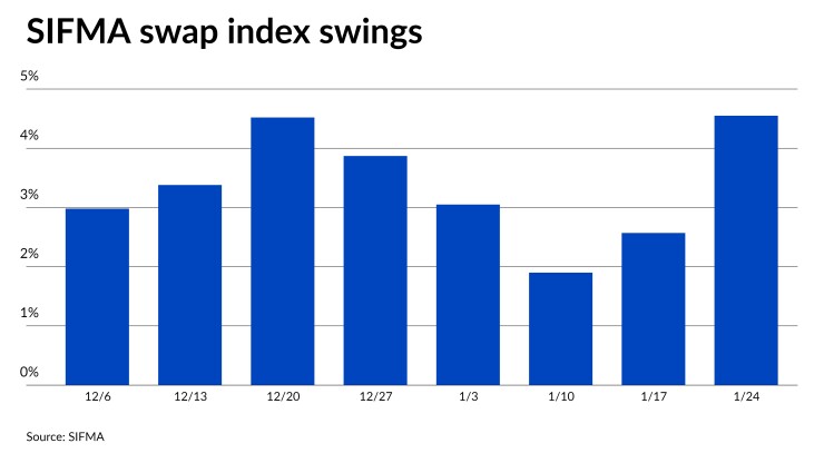 Barclays noted that volatility in short-term muni floating rates has increased. The SIFMA index jumped from 2.57% to 4.55% — “one of the largest weekly increases of all time,” they said.